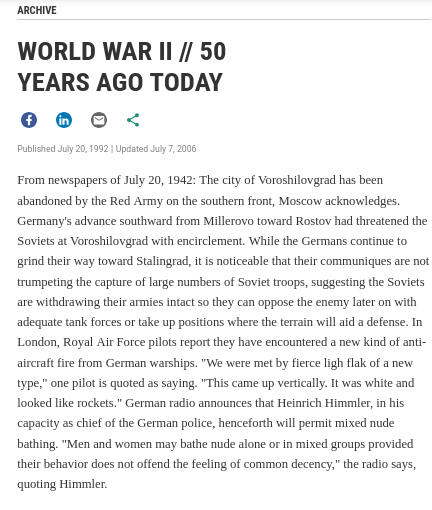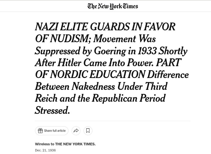 NB: Tampa Bay Times, July 20 1942: “German radio announces that Heinrich Himmler, in his capacity as chief of the German police, henceforth will permit mixed nude bathing. "Men and women may bathe nude alone or in mixed groups provided their behavior does not offend the feeling of common decency," the radio says, quoting Himmler.” Initially, On 3 March 1933 Hermann Göring passed a decree abolishing the “naked culture movement”, which, he said “deadens women’s natural feelings of shame and kills men’s respect for women”. However, soon after, SS major Hans Surén, a committed nudist, had won a change of policy and his work Man and the Sun reissued in 1936 – with racist additions – as Man and Sun: Aryan-Olympian Spirit was popular amongst the Nazi elites and nudist associations under the umbrella title, League for Body Discipline, were ultimately tolerated. By the end of the 1930s, Nazi leaders such as Richard Darré, Reinhard Heydrich and Rudolf Hess had all concluded that the nudism advocated by Surén was in line with Nazi thinking. In the New York Times (December 21, 1936) it was reported “the high command of the Hitler Special Guard in its organ, the Black Corps, has come out strongly in favor of nudism.”
