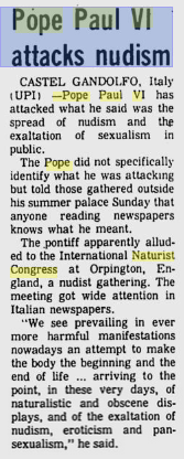 “VATICAN CITY -- Pope John Paul II said today that nudity can deprive the human body of its moral character and dignity and turn people into mere objects.