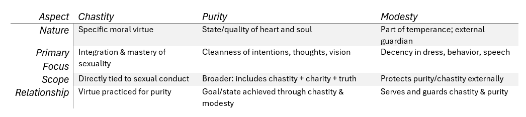 In Catholic teaching, purity, chastity, and modesty are closely interconnected virtues related to sexuality, the dignity of the person, and holiness of life. They are all rooted in the Catechism of the Catholic Church (especially CCC 2337β2359 on chastity and 2517β2533 on purity). Hereβs a clear breakdown of their meanings and differences.